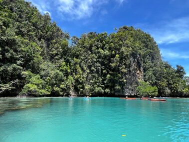 Pakime laagri kokku ja laadime selle paadile. Teine retk läbi saarestiku keskse osa. Väisame jõulupuu laguuni, uudistame iidseid kaljujooniseid ning käime nahkhiirte koopas. Seejärel snorgeldame mereveest osaliselt eraldatud järves, kus elutseb arvukalt meduuse. Maailmas on teadaolevalt kokku vaid kaheksa meduusijärve, mistõttu on snorgeldamine keset arvukaid mittemürgiseid meduuse kahtlemata unikaalne ja meeldejääv mälestus. Lõunatame taaskord võimsa korallrifiga rannal, kus saame ka snorgeldada. Peale lõunat väisame müstilise loodusliku skulptuuriga „Mõtlik naine” koobast. Päevadistants kajakkidel ca. 10-12 km. Esimene ööbimine koos õhtusöögiga Yapap külalistemajas kahestes tubades, olemas pesemisvõimalus, moskiitovõrk ja/või ventilaator.